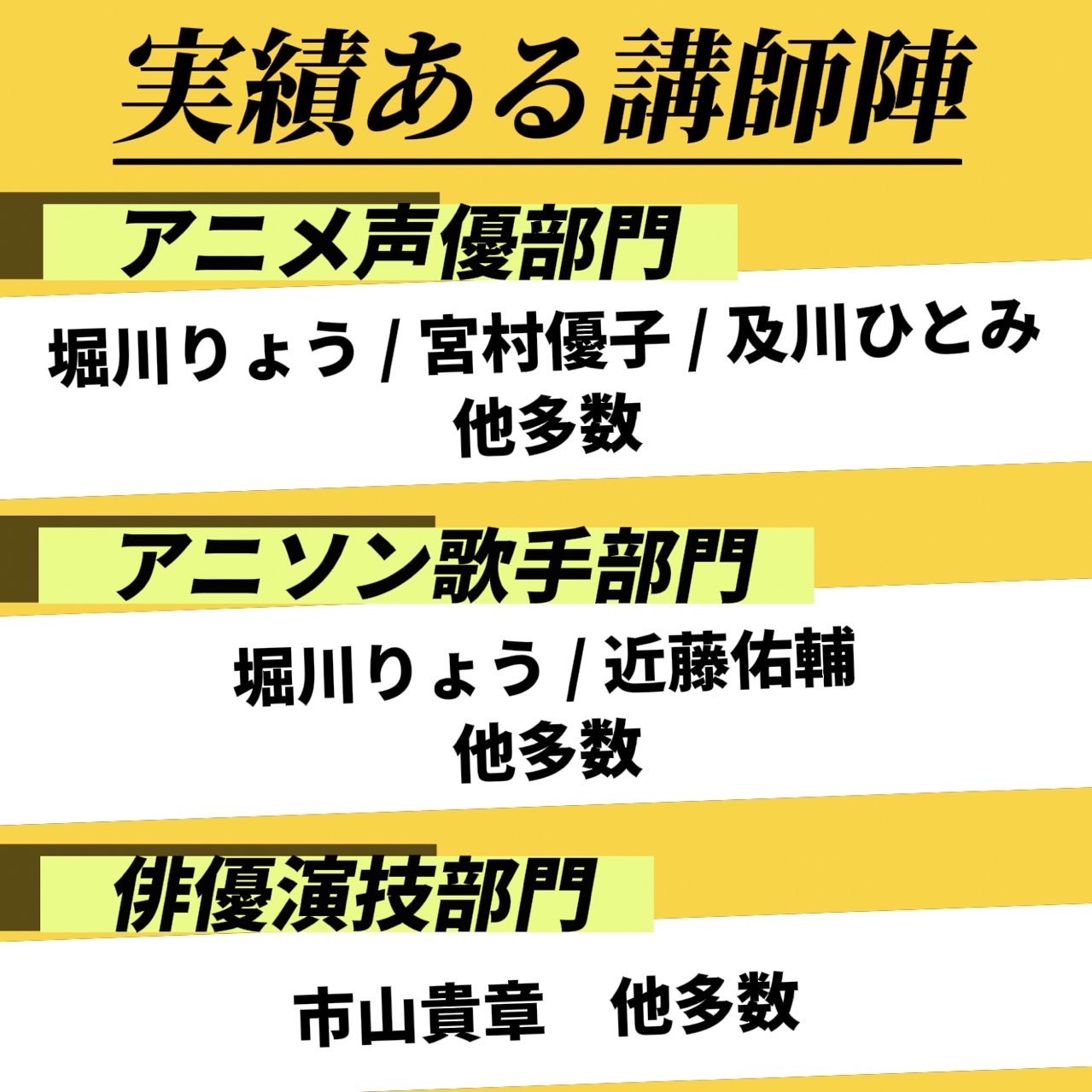 • 現役プロ講師陣 総勢役20名の現役プロ講師陣が、滑舌、発音、発声、演技、感情表現など、声優に必要な技術をプロの視点で丁寧に指導します。アニソン歌手レッスンもございます。